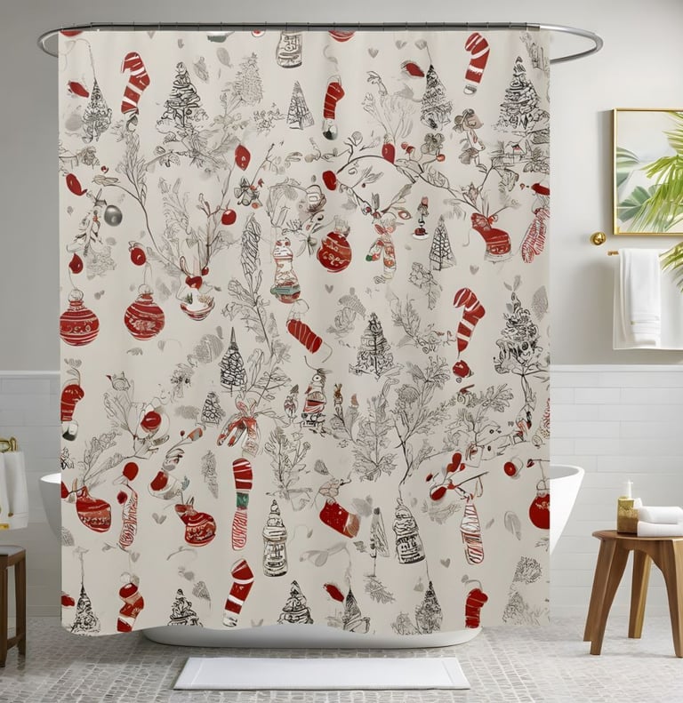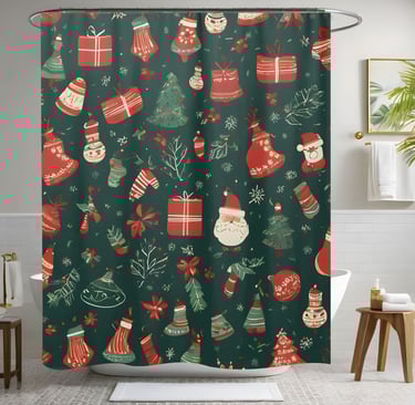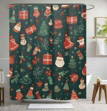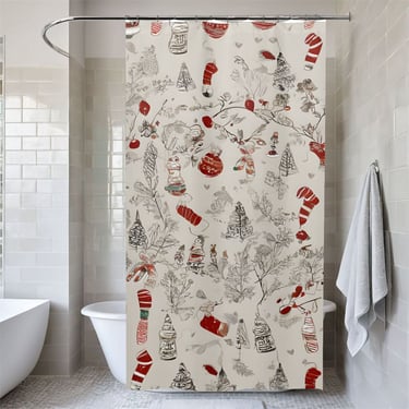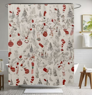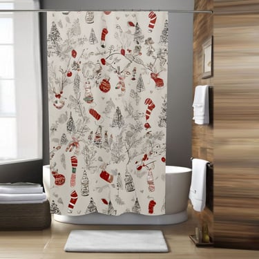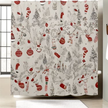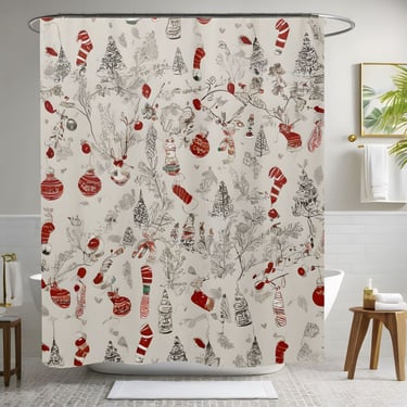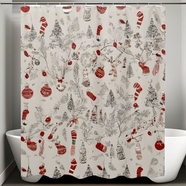 This adorable, hand-drawn style Christmas shower curtain features a festive pattern of classic red and white holiday stockings, ornaments, candy canes, and evergreen trees.