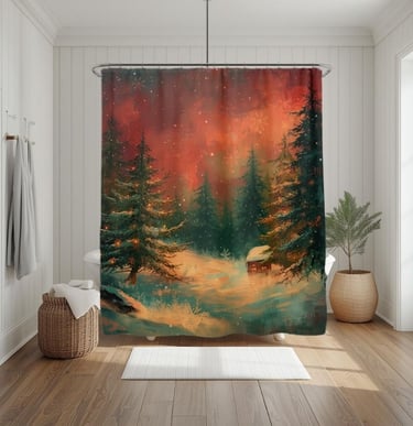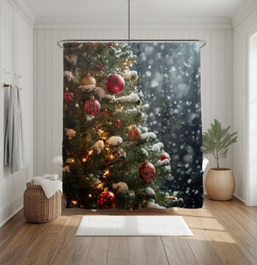 This luxurious shower curtain captures that exact moment. It features a magnificently decorated Christmas tree, loaded with beautiful red and gold ornaments and topped with a bright star.