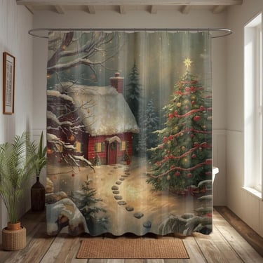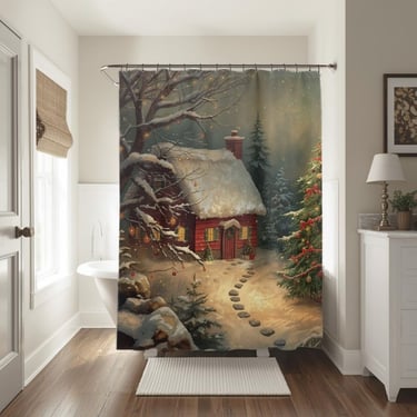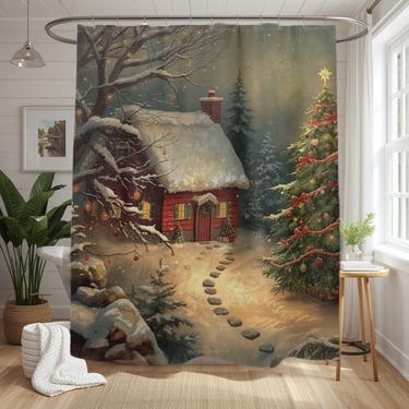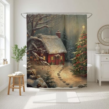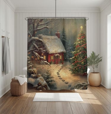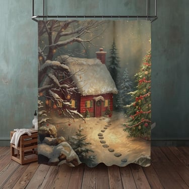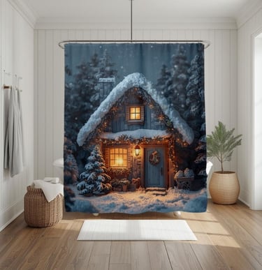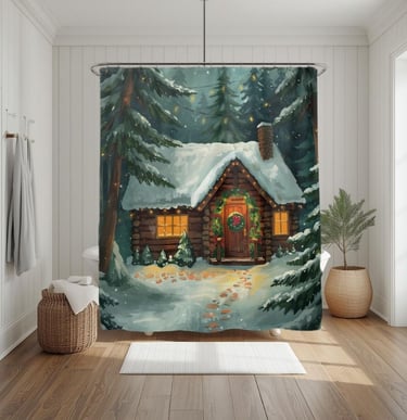 Cozy Winter Cabin Christmas Tree Watercolor Snowy Shower Curtain
