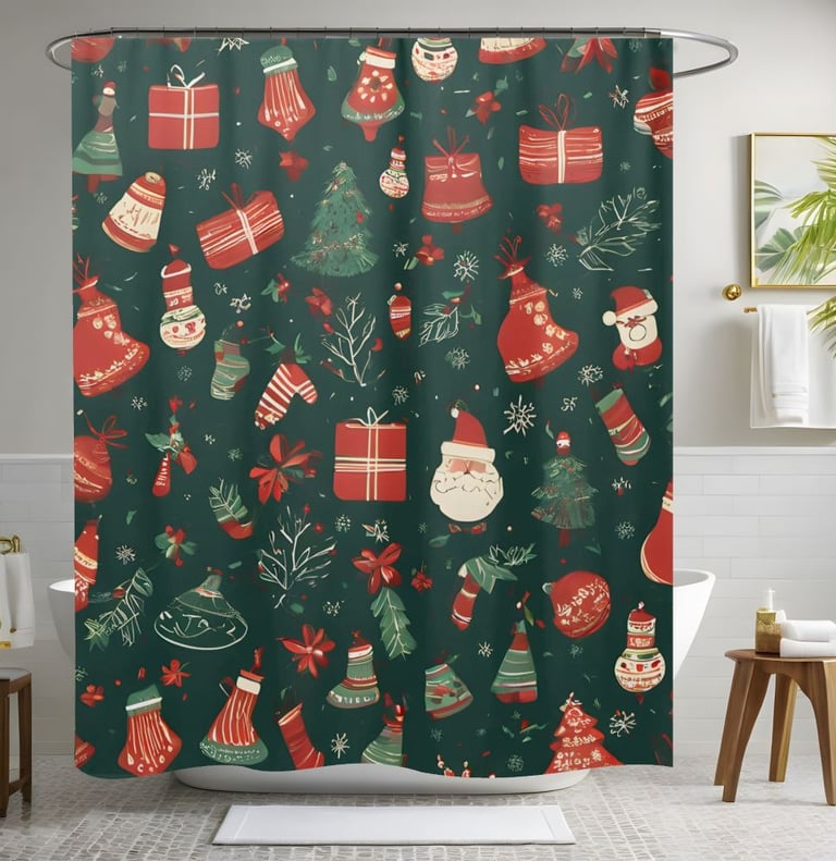 This red and green shower curtain is a high-quality, eye-catching Christmas decoration and a perfect stocking stuffer idea.