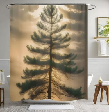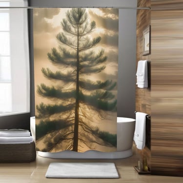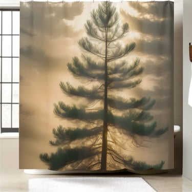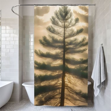 This shower curtain features a majestic big pine tree as the focal point of a misty woodland scene, creating a refreshing and visually stunning piece of bathroom decor.