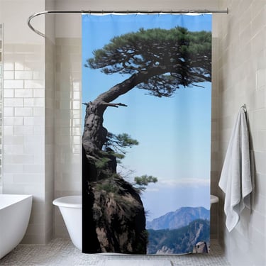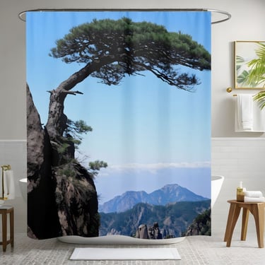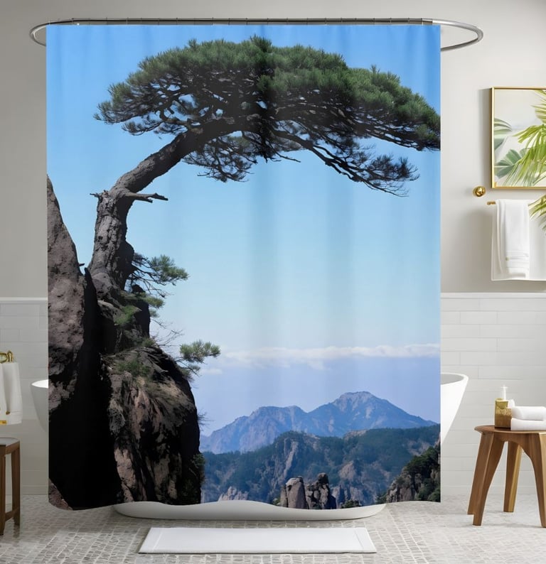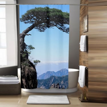 Find a moment of quiet connection with nature through this beautiful mountainside shower curtain.