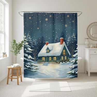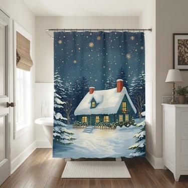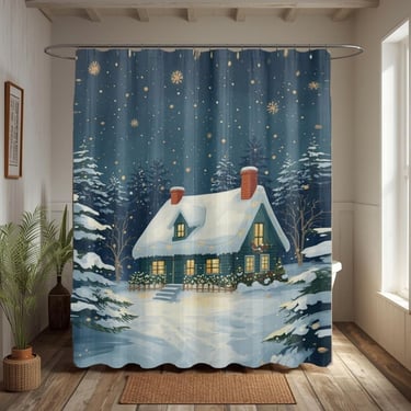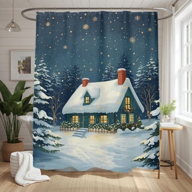 Experience the peace of a winter night with this Peaceful Cabin Christmas Shower Curtain.