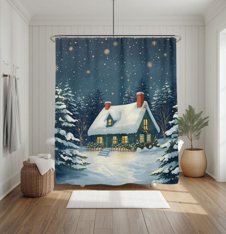The design features a glowing cabin among snow-covered pines under a starry sky — a serene and festive touch for your holiday bathroom décor.