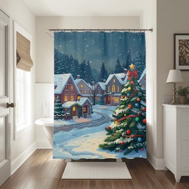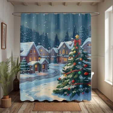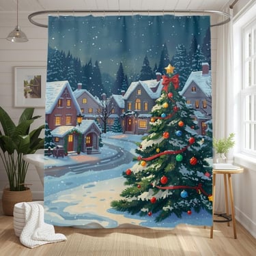 Perfect for adding a festive touch to your bathroom, this curtain captures the beauty of the season with its cozy cottages, glowing windows, and gentle falling snow.