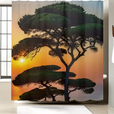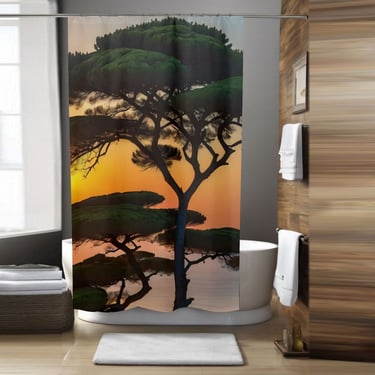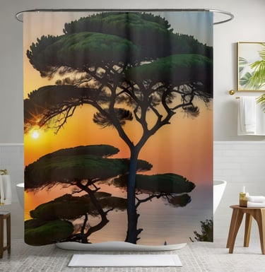 This shower curtain showcases a serene pine tree against a vibrant green landscape, all bathed in the calming light of the day's end.