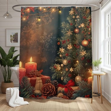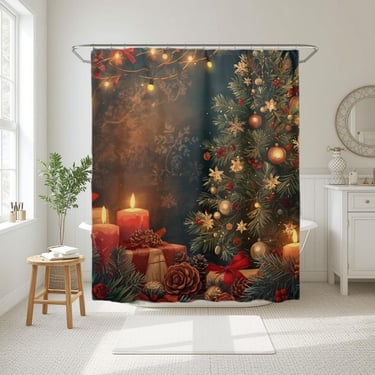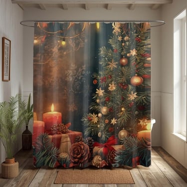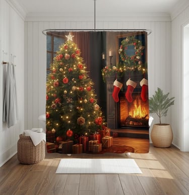 This isn't just a shower curtain—it’s a window into a cozy Christmas Eve, filled with warmth, nostalgia, and a touch of enchanting drama.