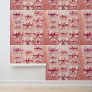 Our Elegant Pink Watercolor Bows Pattern Wallpaper boasts pretty pink watercolor bows, delivering a refreshing pop of color and charming elegance to any accent wall.