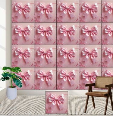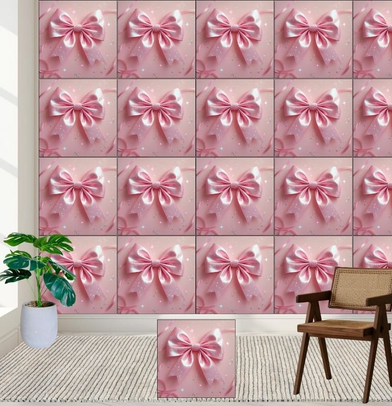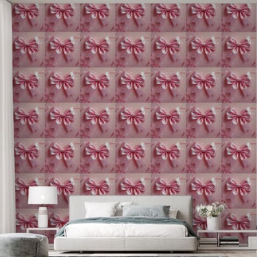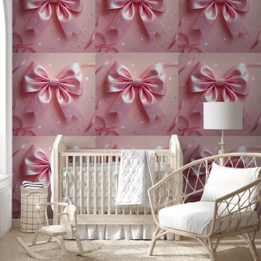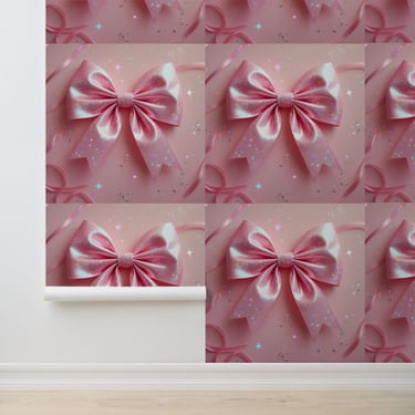 This high-quality wall mural features a beautifully detailed, large pink satin bow with an iridescent, sparkling finish that catches the light from every angle.